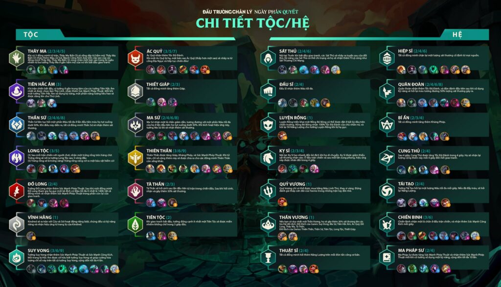 Chi tiết chức năng của từng hệ cũng như các tướng trong từng tộc, hệ mụi người tham khảo dưới hình nhé.