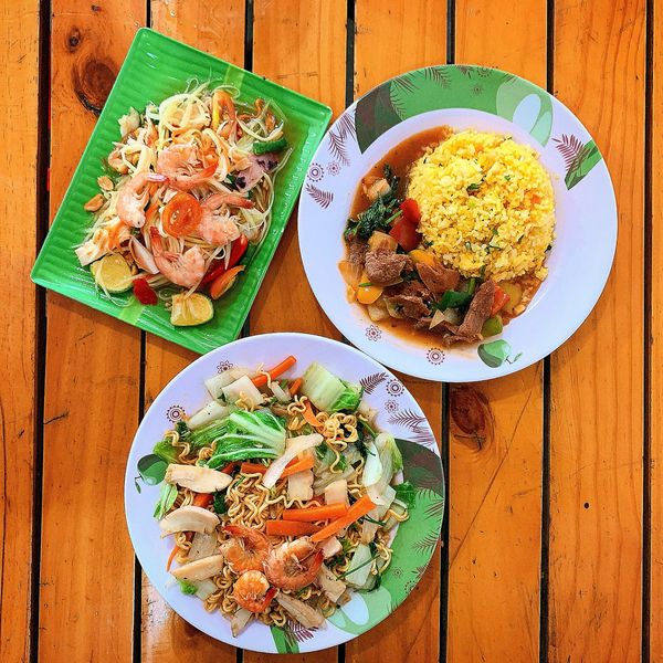 Tui đi 2 người gọi 1 phần cơm bò + mì xào, được anh chủ bonus thêm 1 phần Som (gỏi) vì khách quen ![]()